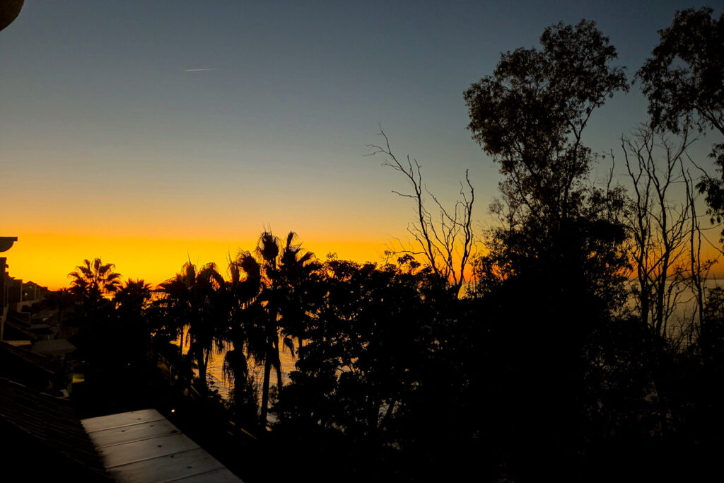 Wie auch schon in den letzten Tagen: Sonnenaufgangsspaziergang am Meer. Bevor wir losgehen, schauen wir uns die Farben von der Dachterrasse an.