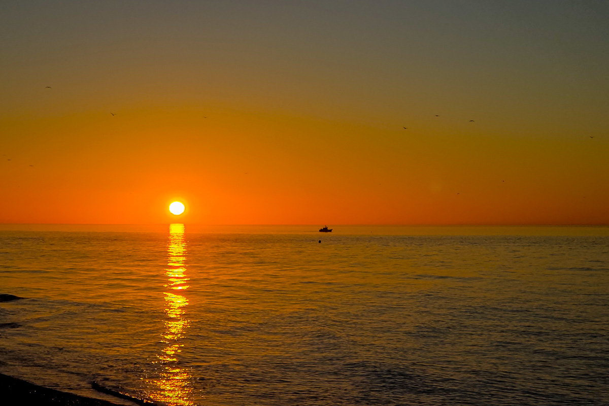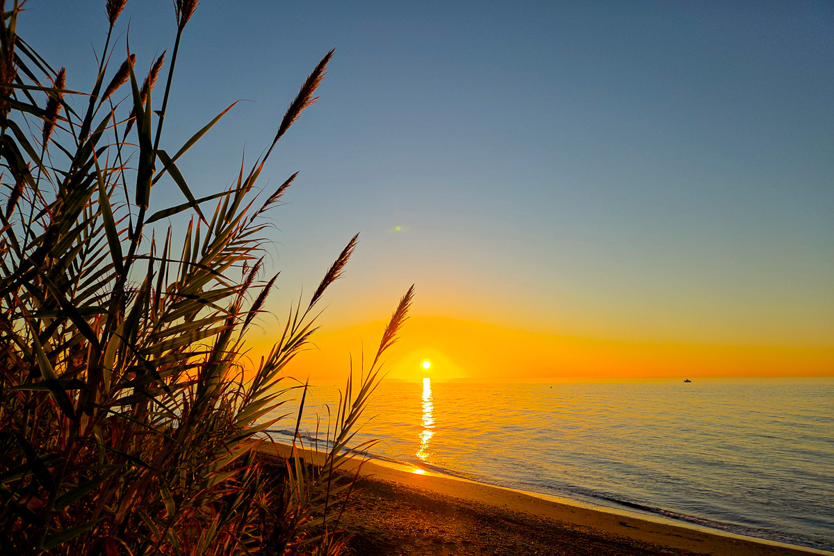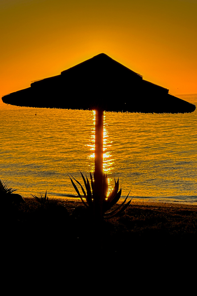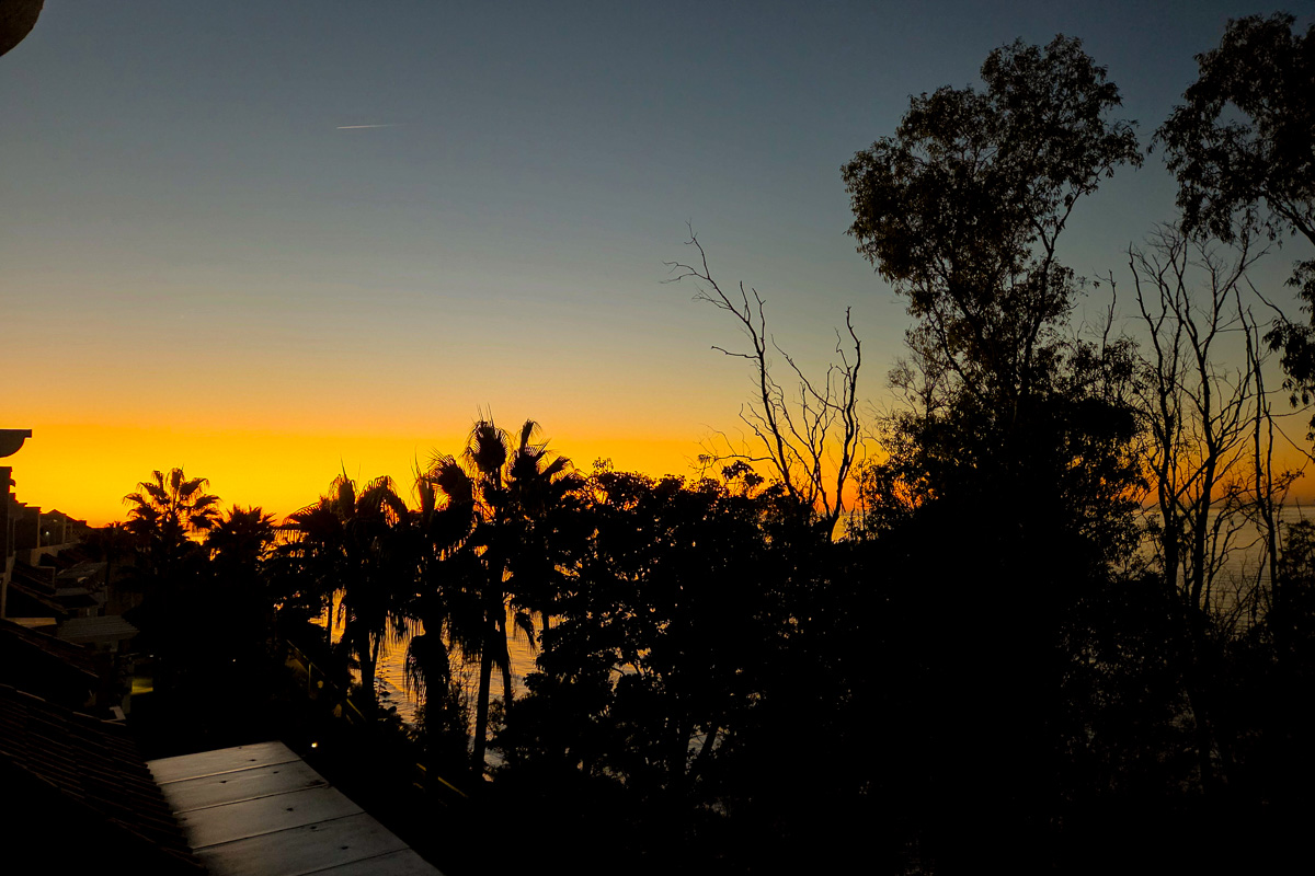 Wie auch schon in den letzten Tagen: Sonnenaufgangsspaziergang am Meer. Bevor wir losgehen, schauen wir uns die Farben von der Dachterrasse an.